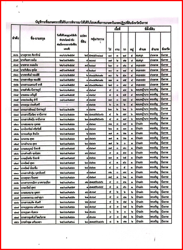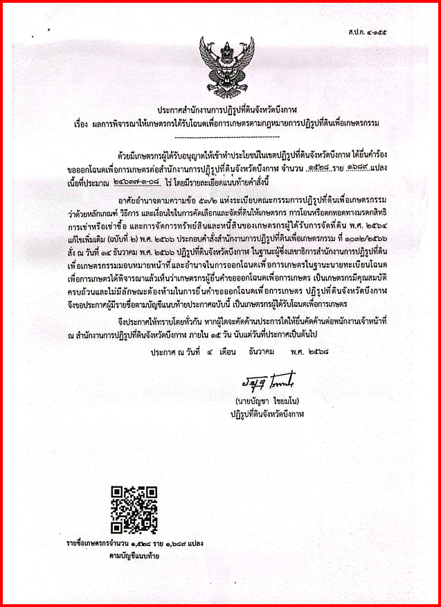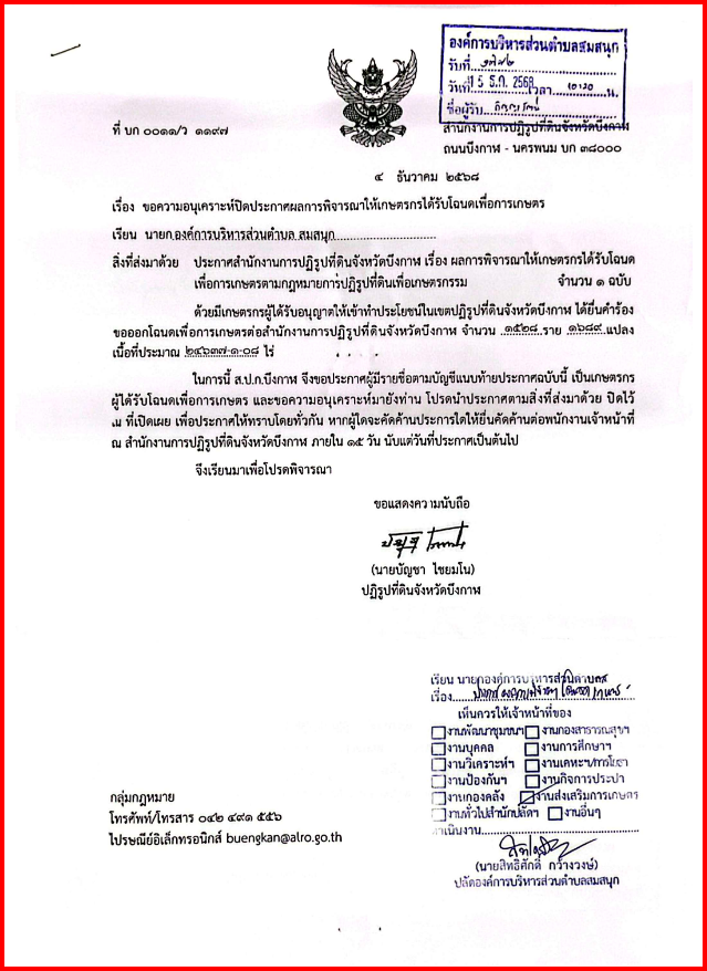 description อ้างถึง หนังสือสำนักงานปฏิรูปที่ดินจังหวัดบึงกาฬ ที่ บก 0011/ว 1197 วันที่ 4 ธันวาคม 2568 เรื่องขอความอนุเคราะห์ปิดประกาศผลการพิจารณาให้เกษตรกรได้รับโฉนดเพื่อการเกษตร ตามที่ สำนักงานปฏิรูปที่ดินจังหวัดบึงกาฬเรื่องขอความอนุเคราะห์ปิดประกาศผลการพิจารณาให้เกษตรกรได้รับโฉนดเพื่อการเกษตร ด้วยมีเกษตรกรผู้ได้รับอนุญาตให้เข้าทำประโยชน์ในเขตปฏิรูปที่ดินจังหวัดบึงกาฬ ได้ยื่นคำร้องขอออกโฉนดเพื่อการเกษตรต่อสำนักงานการปฏิรูปที่ดินจังหวัดบึงกาฬ จำนวน 1,528 ราย 1,628 แปลงเนื้อที่ประมาณ 24637-1-08 ไร่ รายละเอียดตามบัญชีรายชื่อแนบท้ายประกาศนี้ person maximum05382